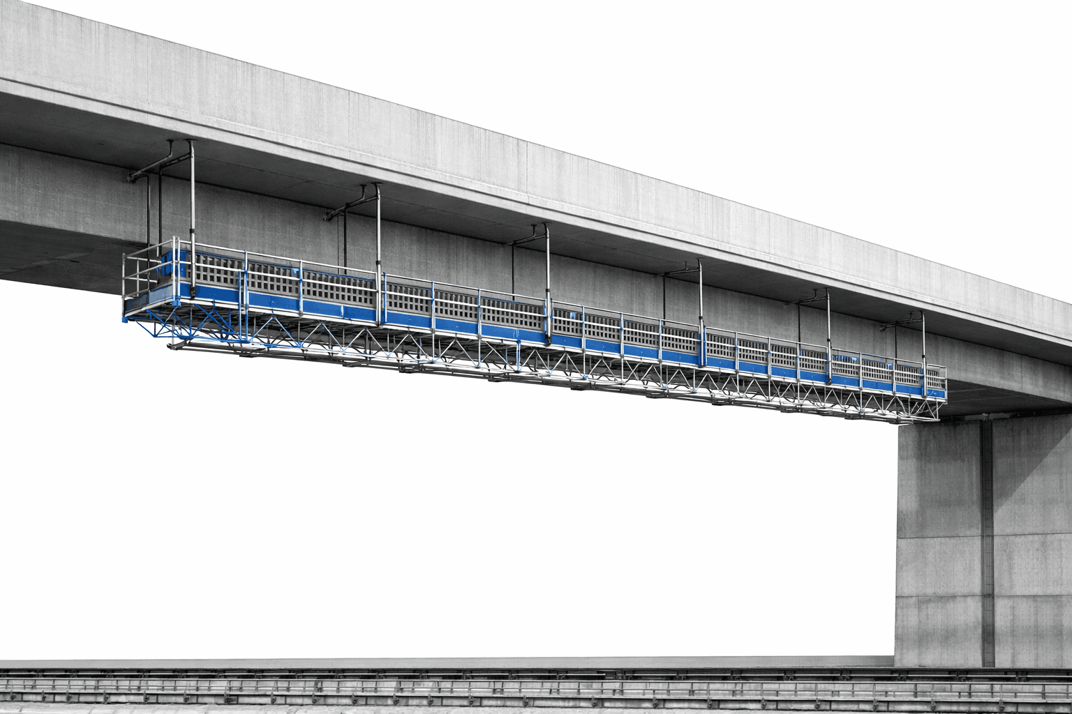 Abgehängte Gerüstsysteme für schwer zugängliche Bereiche – ideal für Brückenarbeiten, Unterseiten und Arbeiten in großer Höhe ohne Bodenaufbau.